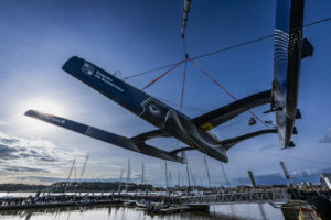 Entre l’eau et l’air, après plus de deux ans de construction le très innovant maxi-trimaran volant Gitana 18 du skipper Charles Caudrelier mis à l’eau à Lorient La base. Les